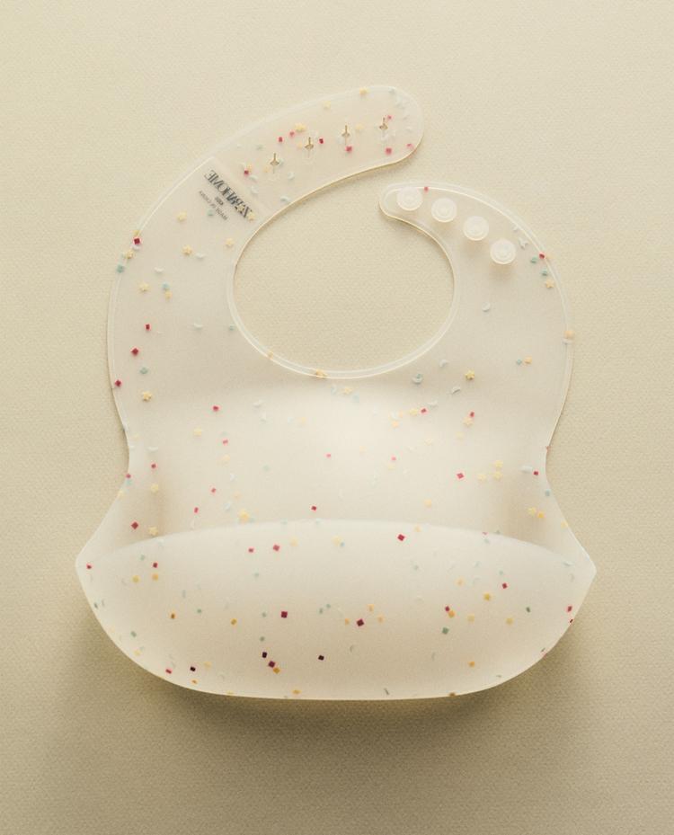 五彩纸屑图案硅胶儿童围兜,饰有月亮和星星图案。