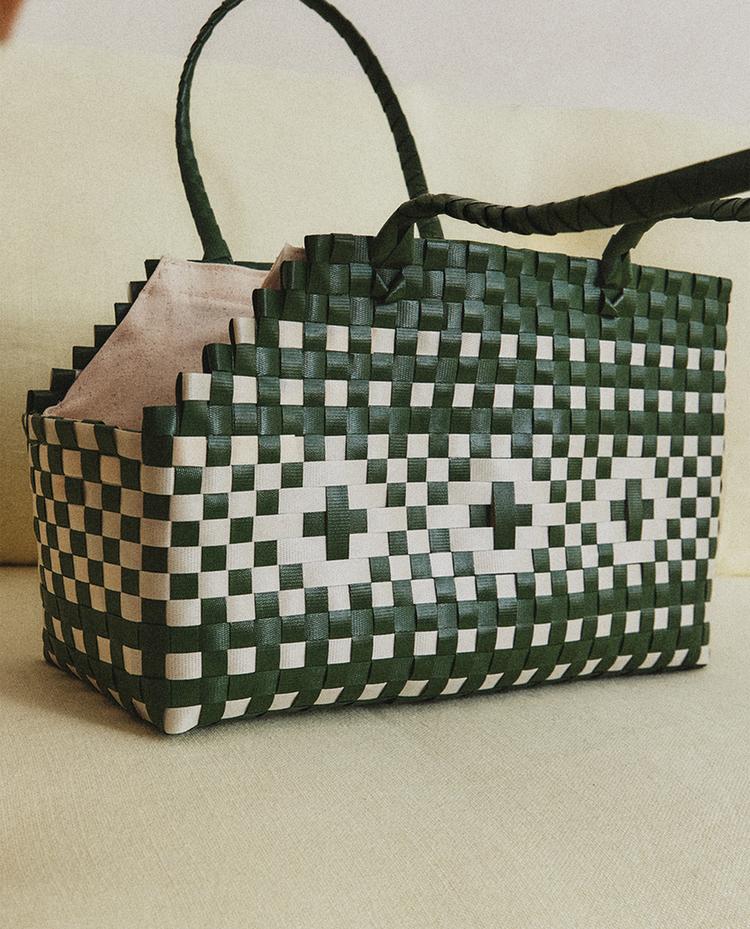 这款宠物包采用撞色编织设计,配有双提手和棉质内衬。侧面开口方便宠物舒适地探出头部。
