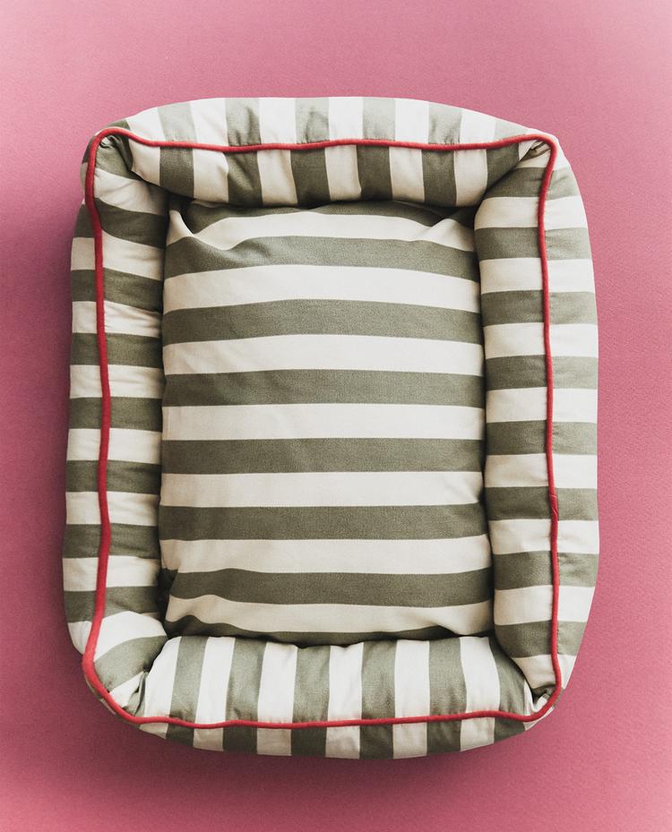 棉质宠物床,饰有宽条纹和撞色滚边细节。附带配套靠垫,提升舒适度。