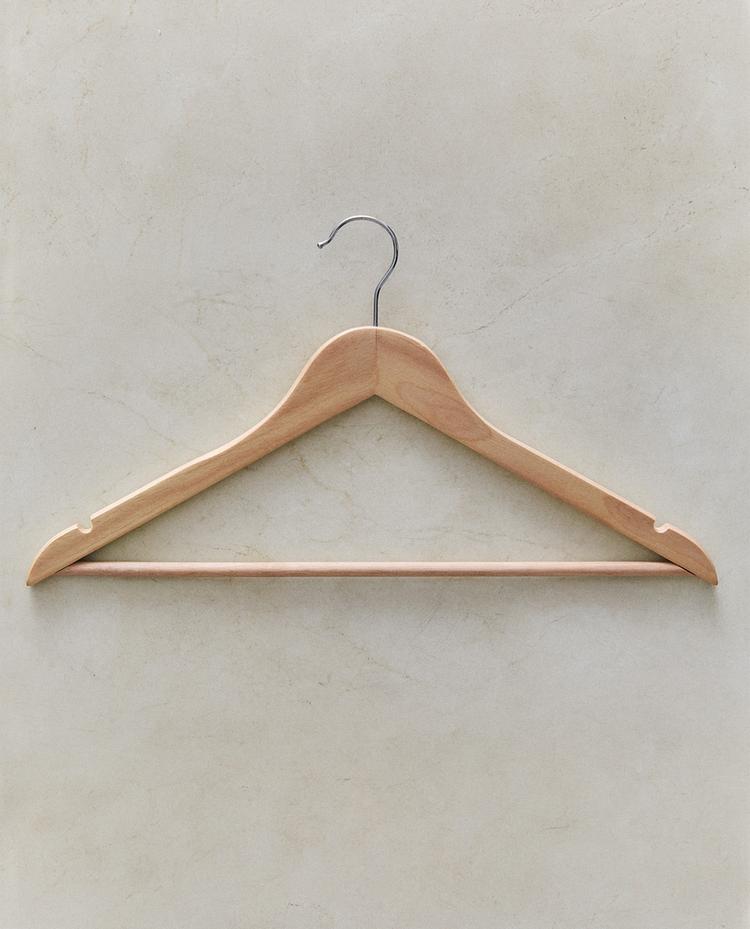 漆面木质衣架,设有用于挂裤子的横杆、用于挂肩带的凹口和银色挂钩。