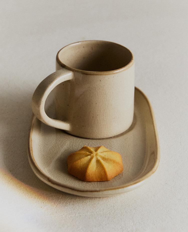炻瓷杯碟套装,包括一个带侧把手的圆柱形杯子和一个低矮的椭圆形托盘。