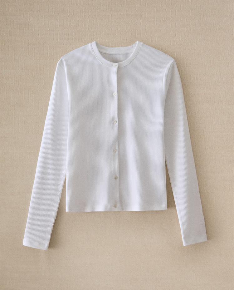 纯色长袖棉质T恤,正面饰有纽扣细节。