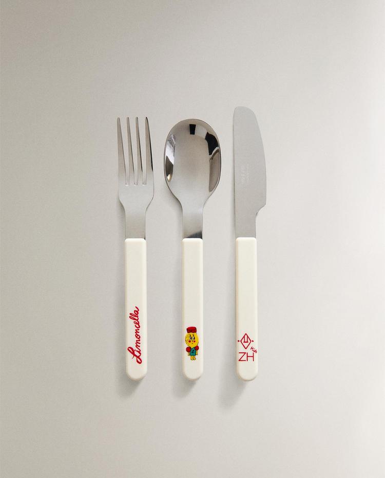 儿童不锈钢餐具套装,手柄饰有 Limoncella x The Animals Observatory 图案。