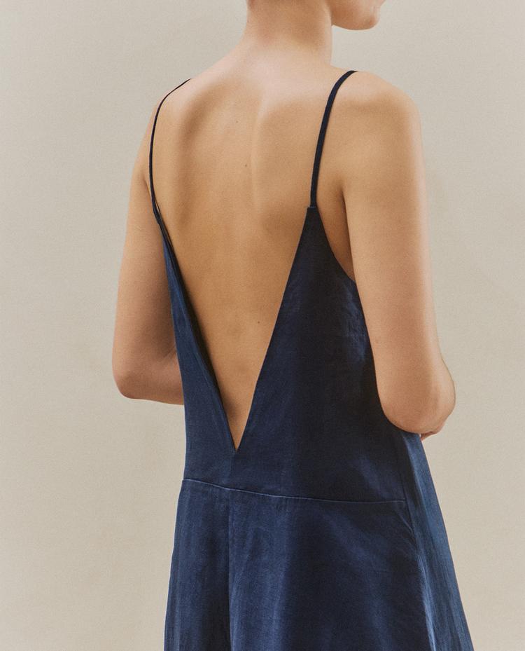 Plain-coloured linen beach dress with a V-neckline, thin straps and an asymmetric hem.