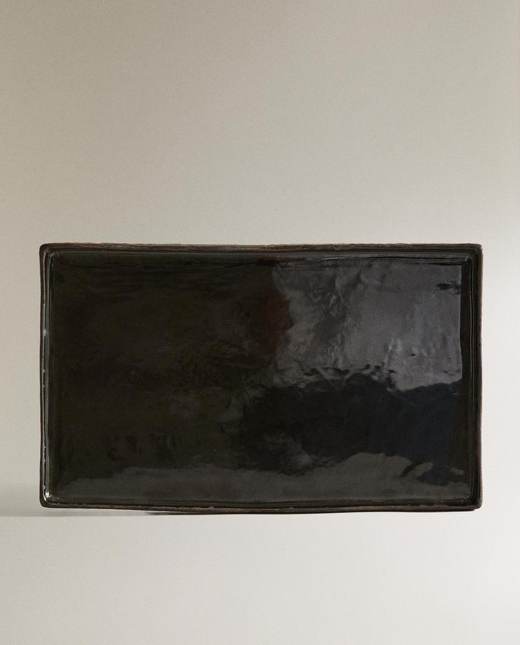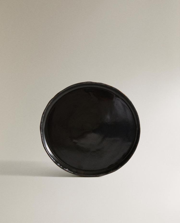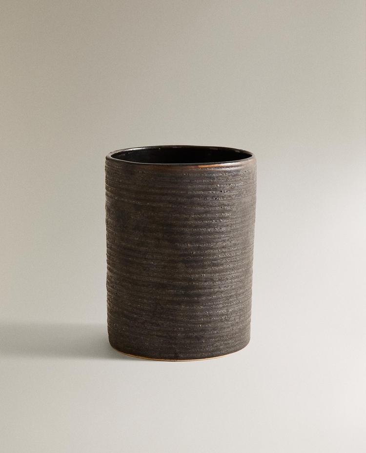 Black ceramic soap dispenser with a contemporary design and handcrafted enamelled finish. Its horizontal lines that create subtle colour variations and a unique visual effect on each piece.