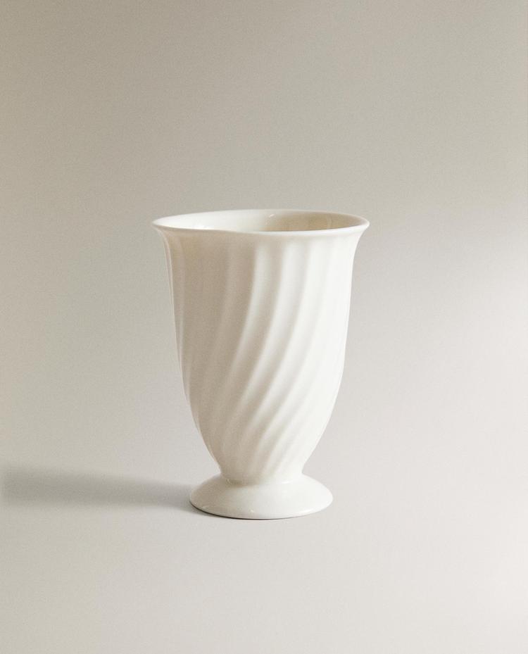 Bathroom toothbrush holder made from white bone china ceramic, featuring a raised vertical pattern, softly tapered conical shape, rounded upper rim and integrated elevated base.