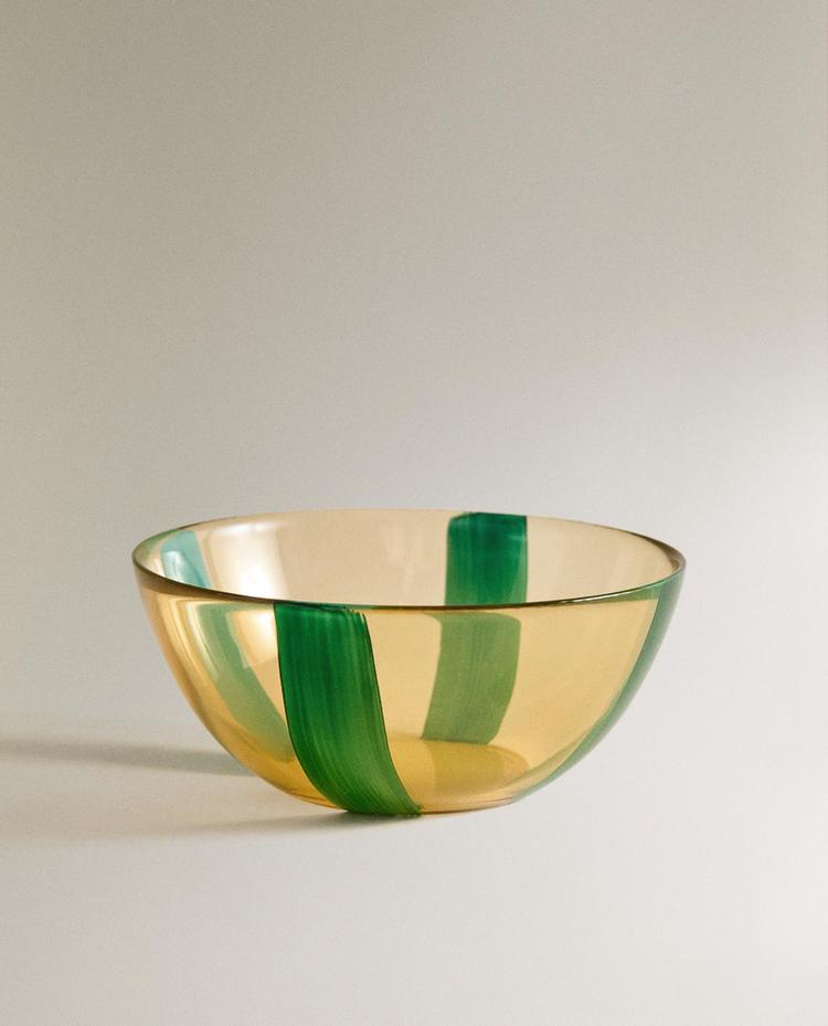 STRIPED GLASS BOWL ¥ 59GREEN|0282/211/500Glass bowl with a painted irregular vertical stripe print design.Capacity: 425 mlHeightWidthDepth5 cm12 cm5 cm¥ 59Enter quantity of units to purchase Quantity updated to 1 units Measurement guideAdd ¥ 59