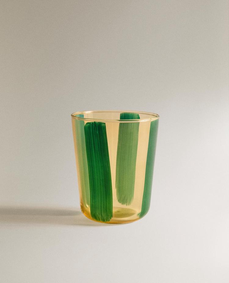 STRIPED GLASS TUMBLER ¥ 49GREEN|0282/401/500Glass tumbler with a painted print design comprising irregular vertical stripes that add depth and craftsmanship.Capacity: 315 mlHeightWidthDepth9 cm8 cm8 cm¥ 49Enter quantity of units to purchase Quantity updated to 1 units Measurement guideAdd ¥ 49