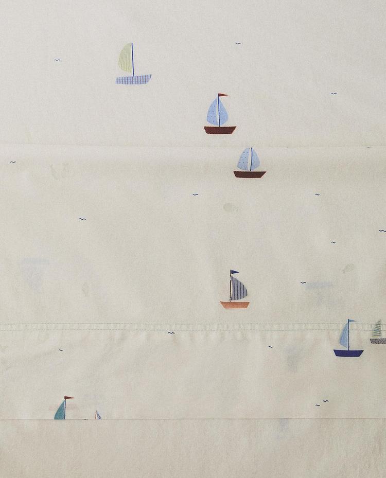 Kids' flat sheet in 200 thread count cotton with a small sailboat design and fish that glow in the dark.