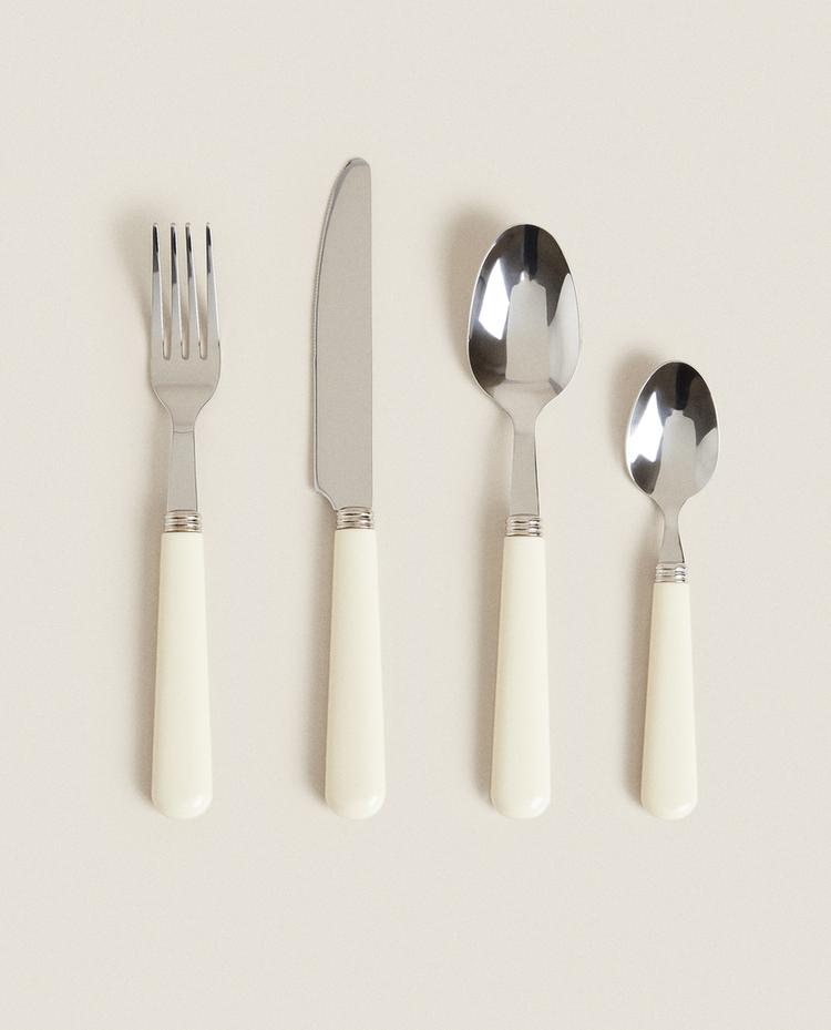 4-PIECE CUTLERY SET WITH COLOURED HANDLE ¥ 159CREAM|8220/311/733Stainless steel cutlery with a simple handle in a neutral tone.The set includes a fork, knife, spoon and dessert spoon.HeightWidthDepth23 cm31 cm15 cm¥ 159Enter quantity of units to purchase Quantity updated to 1 units Measurement guideAdd ¥ 159