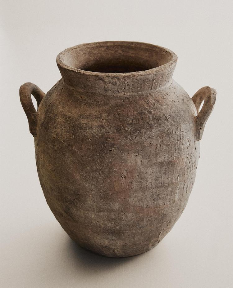 Large oval ceramic vase with medium opening for long stem flowers or branches. Side handles and an antique finish on the surface. May be filled with water.