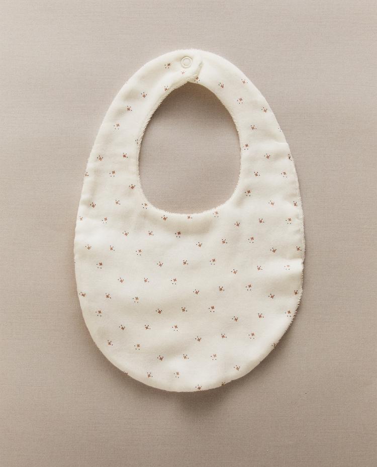 Baby bib made of mini-terry cotton and muslin with a floral design and fastening.