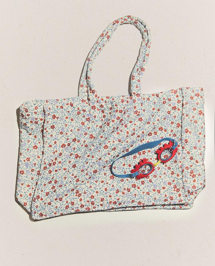Cotton terry beach bag with a floral print, adjustable fastening and shoulder straps.