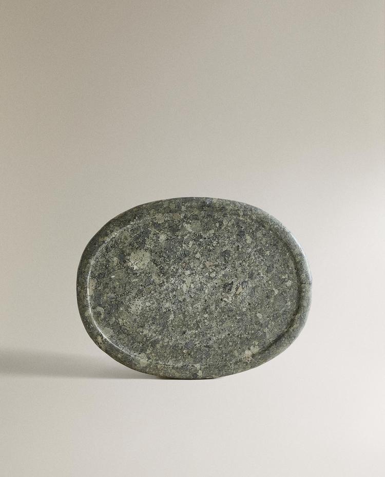 Bathroom tray made of greenish natural marble, with an oval and flat shape, gently defined edges and a polished surface that shows the stone's characteristic grain.