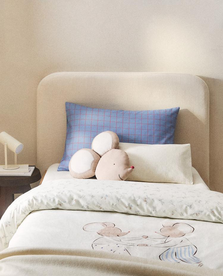 Kids' duvet cover in 200 thread count washed cotton. Reversible design with small mouse, cheese and flower motifs on one side and two larger mice on the other.