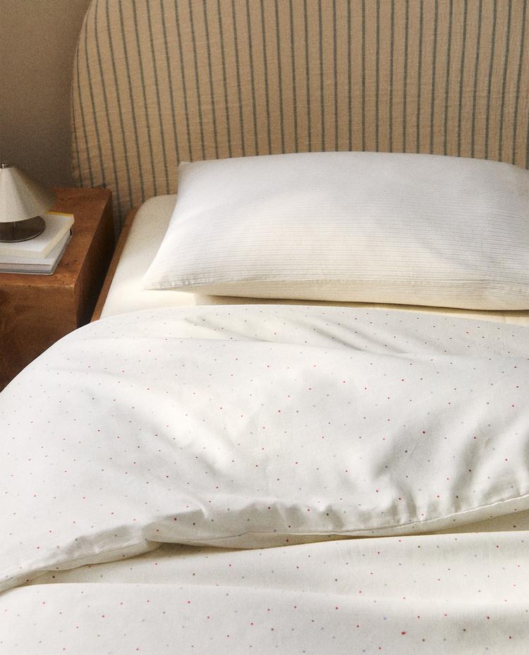 Kids' linen and cotton duvet cover with a coloured dot design.