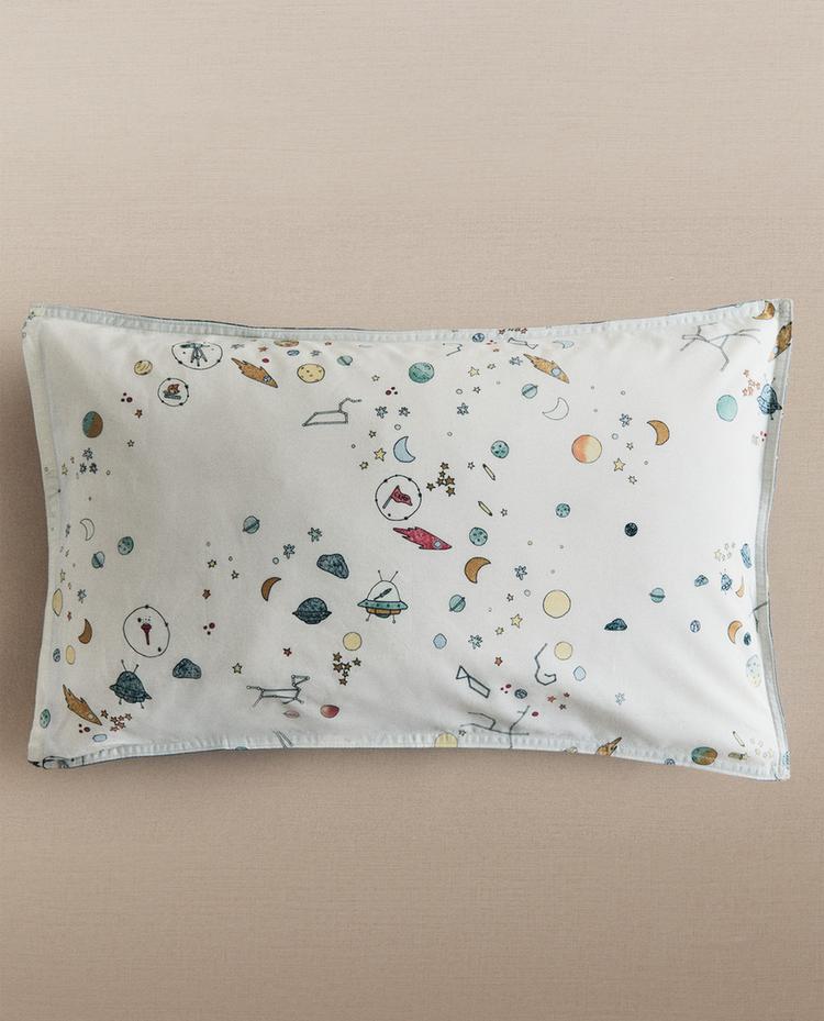 Kids' pillowcase in 200 thread count cotton featuring a reversible design with space-inspired motifs and glow-in-the-dark details.