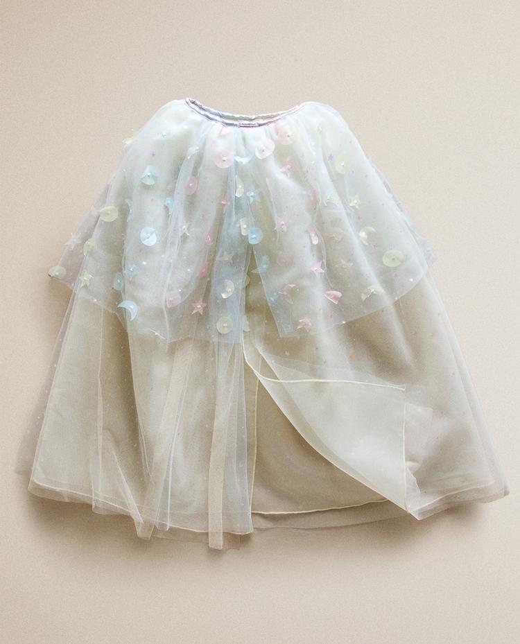 Kids' cape costume. Decorative shiny details with star, moon and shape motifs in pastel tones.