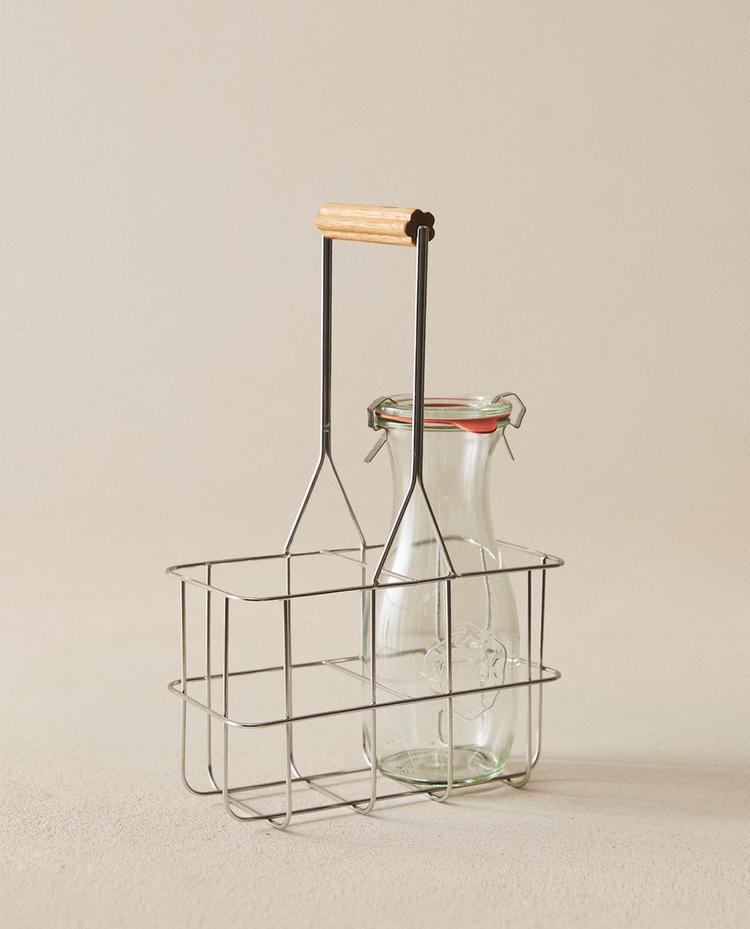 Metal basket with an oak wood handle designed to carry bottles or jars comfortably and securely. Its open structure allows you to easily view and access the contents.