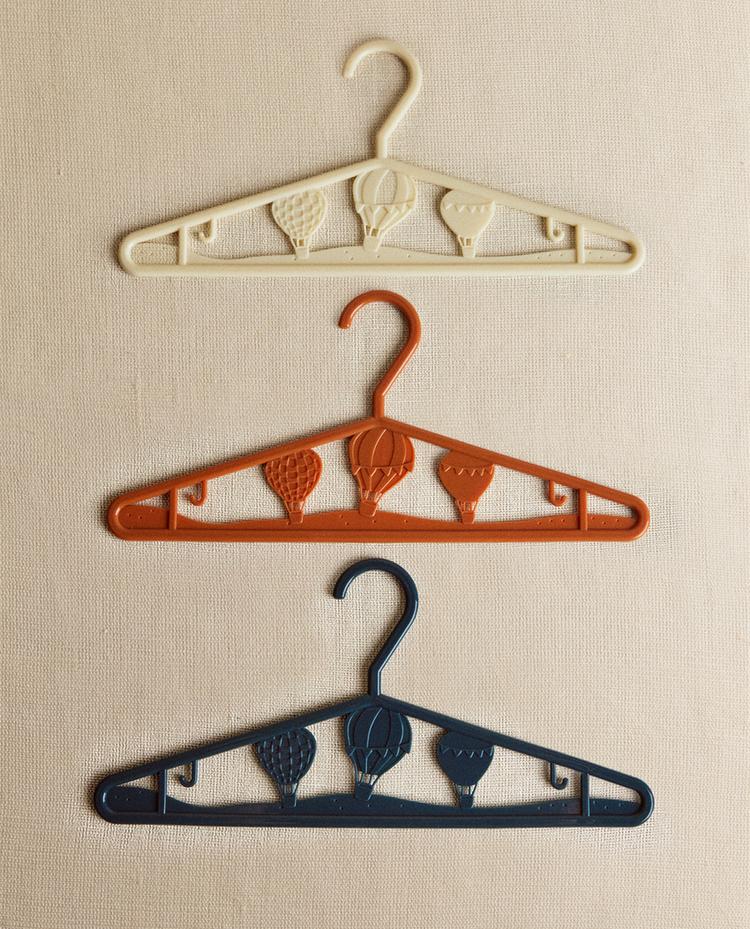 Kids' hangers featuring a central design with hot air balloons in different colours.