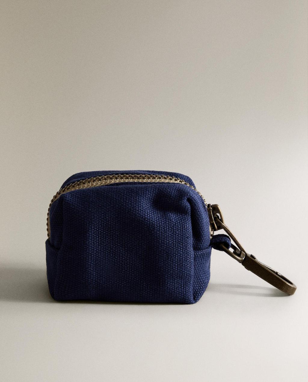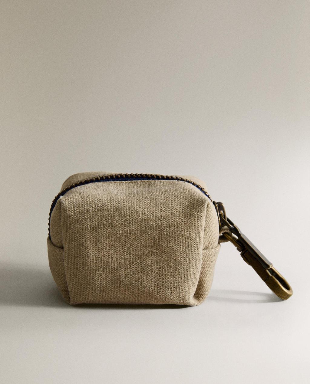 Pet bag dispenser made of a cotton blend with a metal hook and contrast zip fastening.