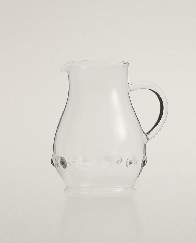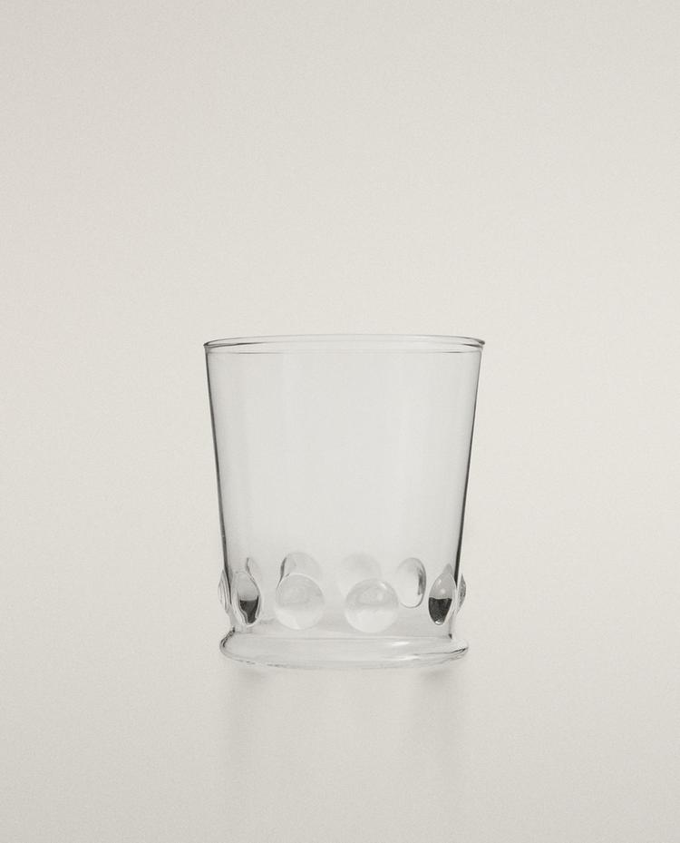 Tumbler made of borosilicate glass, a lightweight and resilient material that is resistant to temperature changes. Featuring a band of raised dots around the base.