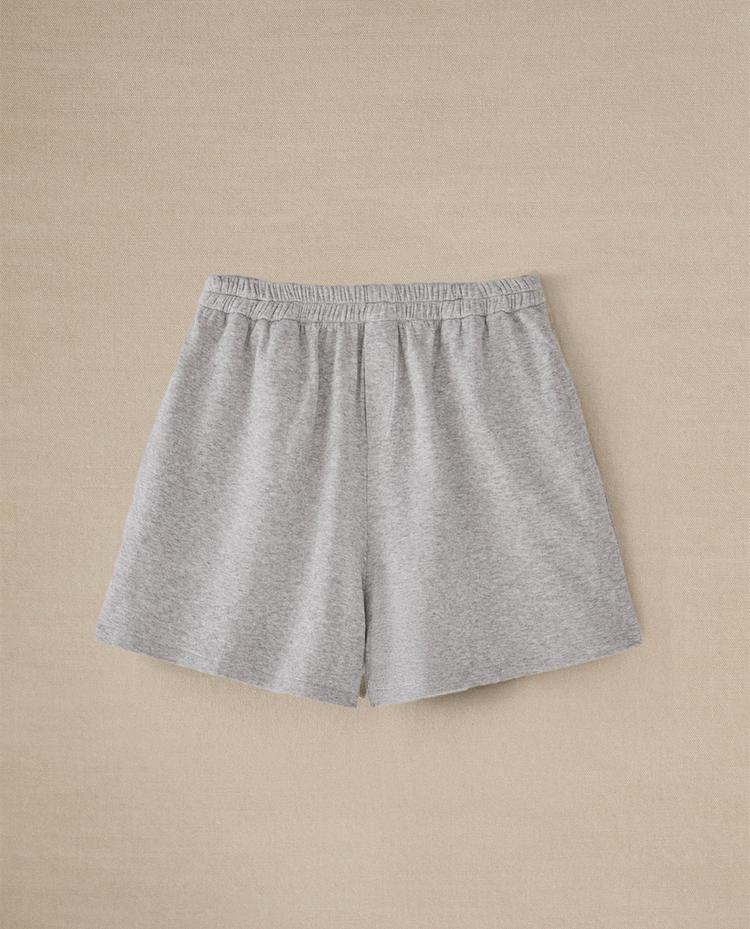 Reversible cotton shorts with a plain design and elastic waistband. One side is light grey and the other is in dark grey.