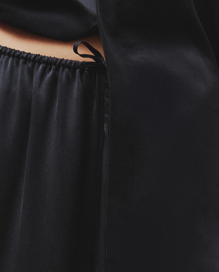 Plain-coloured silk trousers with a tie at the waist for adjusting.
