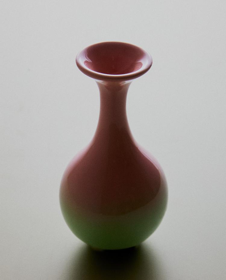 Small ceramic vase with a high neck, enamelled finish and ombré effect in soft tones.