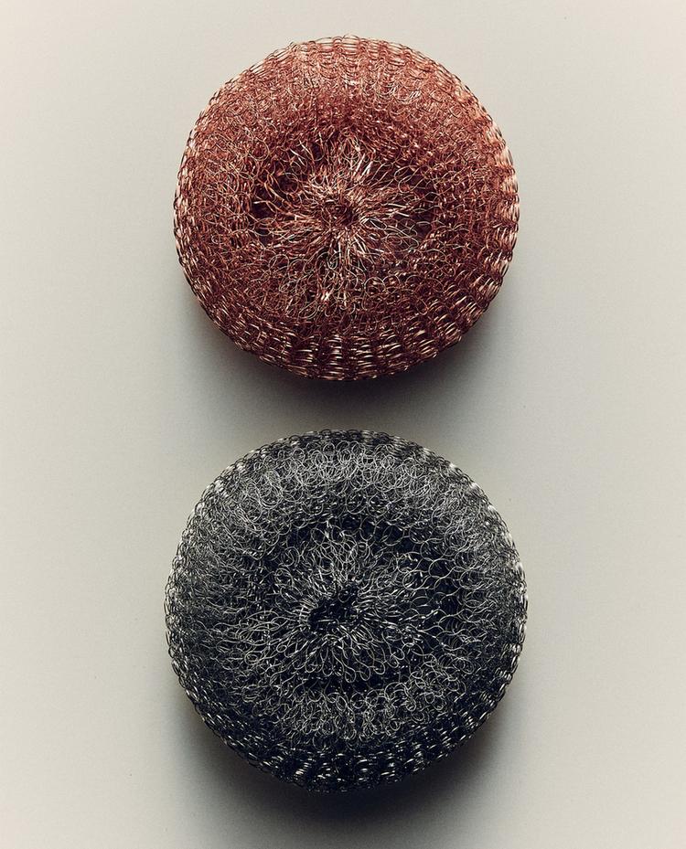 Scourer made of a stainless steel and copper blend. Combines the resistance and abrasive power of the steel to remove embedded dirt with the flexibility of copper for more delicate cleaning.