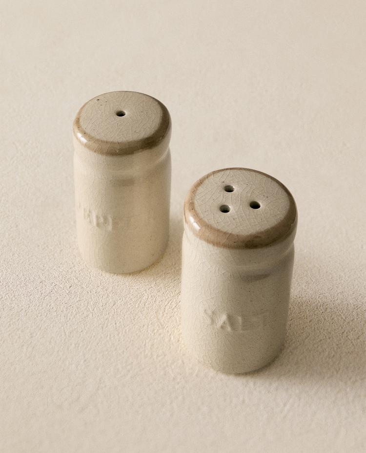 Stoneware salt and pepper set comprising two cylindrical pieces, with dispensing holes at the top and raised lettering integrated into the body.