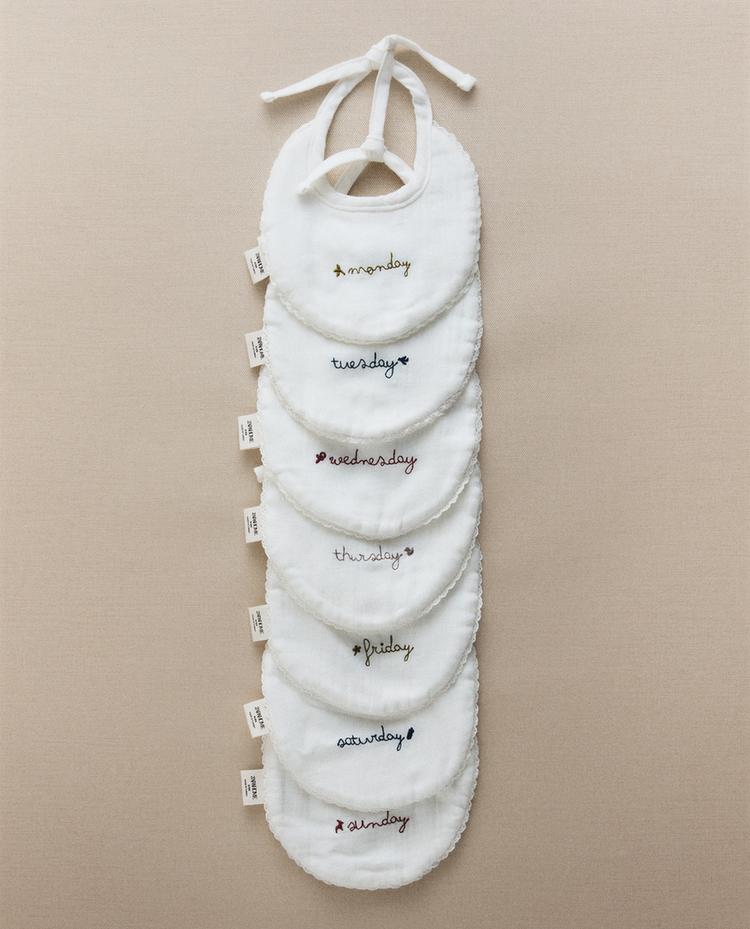 Baby bib with fastening, made of cotton muslin with lace around the edge and an embroidered design with days of the week. Sold in packs of 7. Comes with a bag for storing.